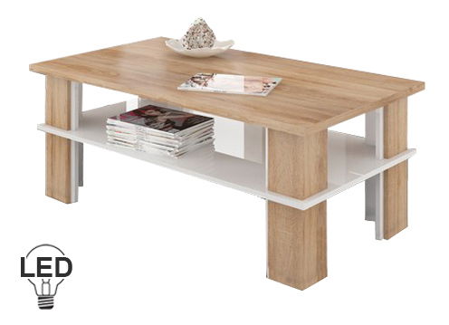Stolić za kavu s LED rasvjetom i praktičnom policom. U kombinaciji boje sonoma svijetla i bijele boje visokog sjaja.