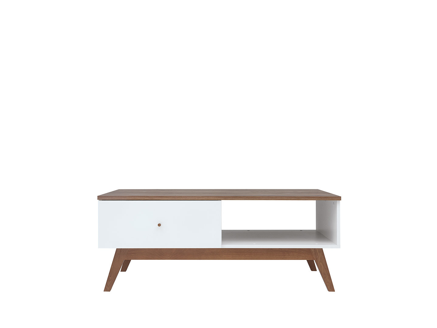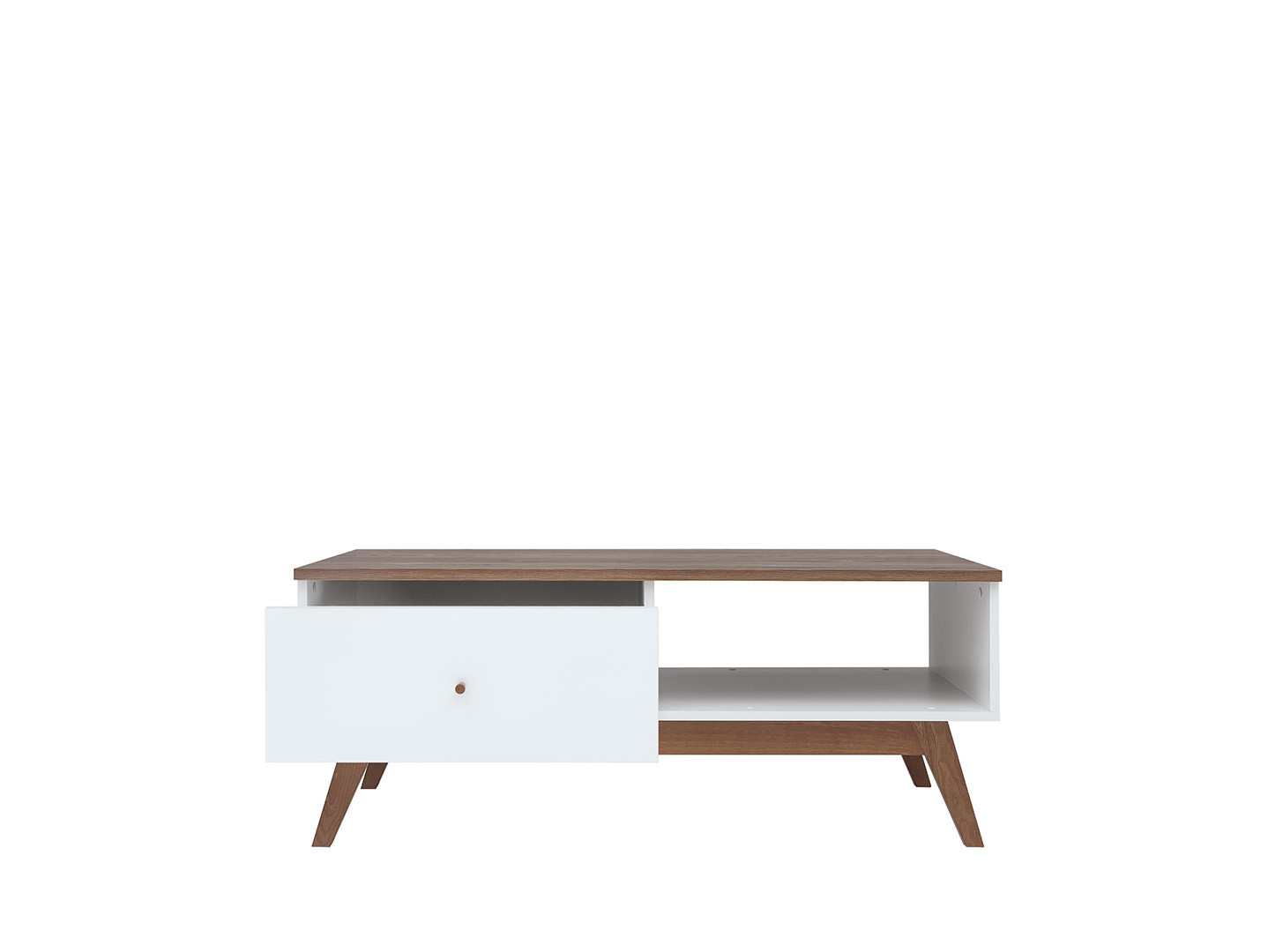 Stolić za kavu jedinstvenog dizajna ima praktičnu ladicu i otvorenu policu. Noge su drvene, a ladica ima drvenu ručku.