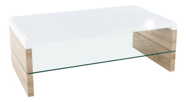 Stolić za kavu modernog dizajna s gornjom pločom bijele boje i staklenom policom od kaljenog stakla. Kombinacija boja hrast sonoma + bijela