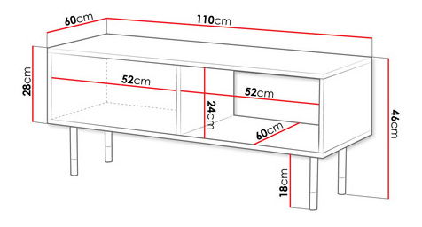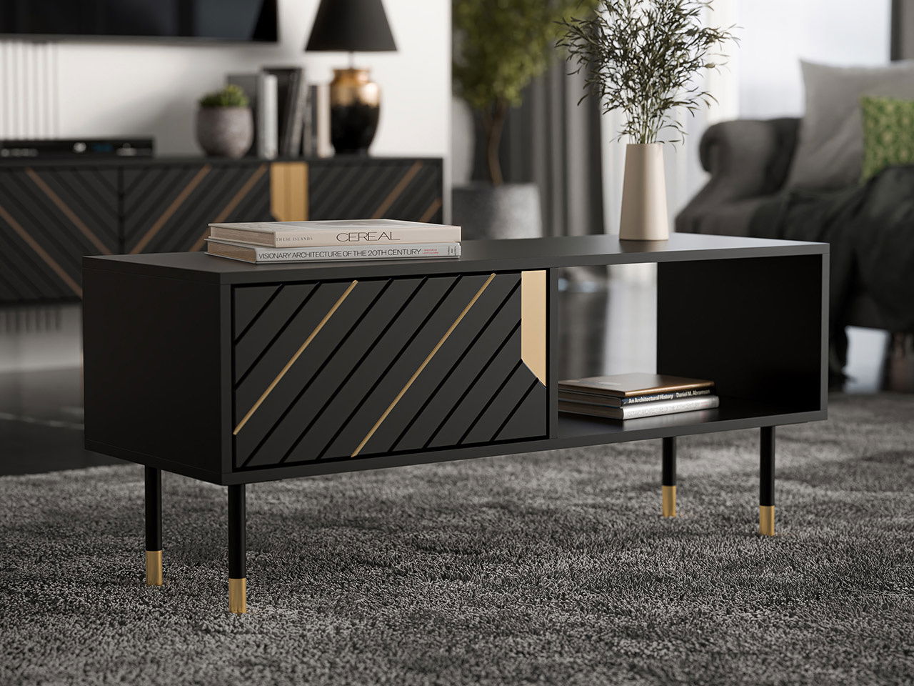 Stolić za kavu idealan je izbor za one koji traže udobnost i stil. Dimenzije: širina: 110 cm, visina: 46 cm, dubina: 60 cm Izvedba: korpus: laminirana ploča debljine 16 mm, fronte: mat crna MDF ploča, debljine 16 mm + zlatni frezani lakirani elementi, rub: ABS, šarke FI35, noge: metalne, crno-zlatne, visine 18 cm, bez ručki, nosači namještaja (poklopci se otvaraju prema dolje), sustav otvaranja "PUSH TO OPEN". Jamstvo: 24 mjeseca.