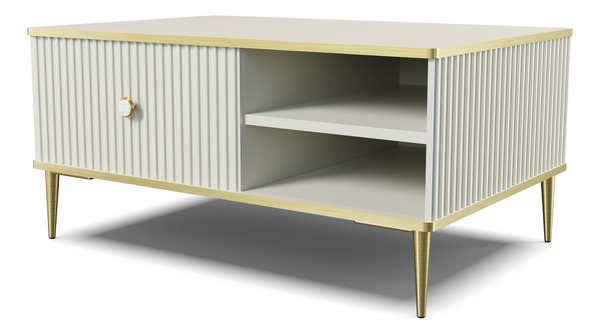 PrikazStolić za kavu je izraz luksuza i elegancije, savršeno se uklapa u moderan ili glamurozan dnevni boravak. Njegov dekorativni izgled, temeljen na preciznom glodanju na prednjim i bočnim stranama, daje interijeru jedinstven karakter i profinjen izgled. Zlatni detalji u obliku metalnih ručki i rubova daju seriji Pietro ne samo eleganciju, već omogućuju i stvaranje jedinstvenog aranžmana temeljenog na klasičnim bojama. Stolić je pažljivo dizajniran i spaja estetiku s funkcionalnošću. Njegova pravokutna ploča idealno je mjesto za piće, grickalice, dekoracije ili omiljene knjige. Police i ladica dodatno pružaju prostor za pohranu koji pomaže održavati dnevni boravak urednim. Stolić za kavu nije samo elegantan dodatak interijeru, već i praktično rješenje koje kombinira profinjen dizajn sa svakodnevnom funkcionalnošću i stvara harmoničan prostor za opuštanje i druženje.