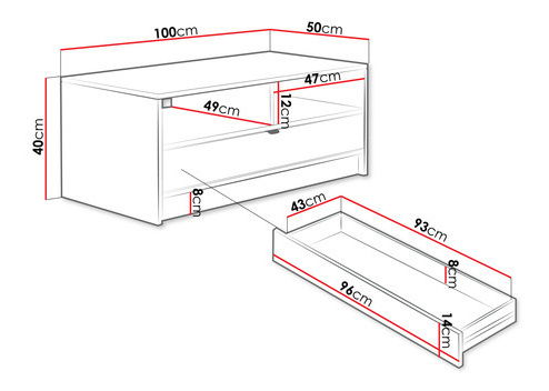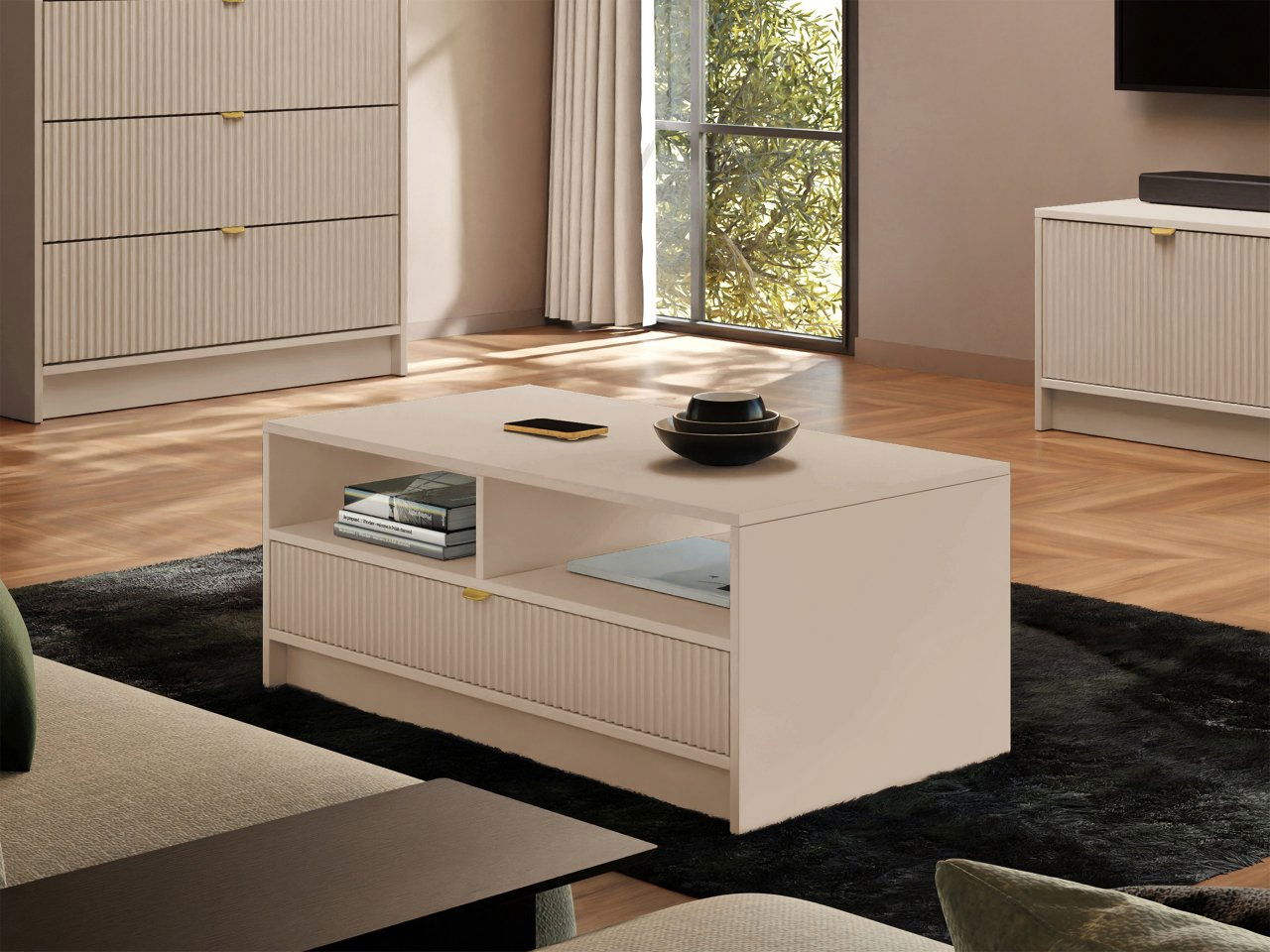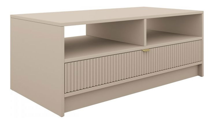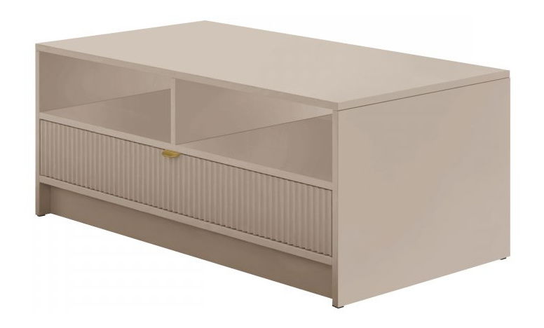 PrikazStolić za kavu je idealan izbor za one koji traže udobnost i stil. Domenom modernog stolića za kavu s ladicom Razimo 1SZ je stilski izgled. Geometrijski oblik u kombinaciji s ukusnim dekoracijama izgleda odlično u svakom interijeru. Žljebljeni umetci su prednost – i minimalističkom interijeru daju dašak avangarde. Još jedna prednost stolića je njegova funkcionalnost. Prostrana gornja ploča pruža dovoljno mjesta za šalice aromatične kave, kao i za slatke ili slane grickalice. Neposredno ispod nalaze se prostrane police – u praksi odlično funkcioniraju kao praktičan prostor za odlaganje daljinskih upravljača, slušalica ili pročitanih novina. Veći pribor pronaći će svoje mjesto u ladici ispod. Dimenzije: širina: 100 cm, visina: 40 cm, dubina: 50 cm. Izvedba: korpus: laminirana ploča debljine 16 mm, fronte: MDF ploča debljine 18 mm, rubovi: ABS i melamin, kuglični klizači, aluminijske ručke zlatne boje, nogice: crni klizači. Jamstvo: 24 mjeseca.