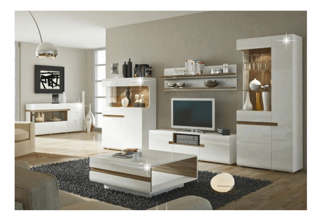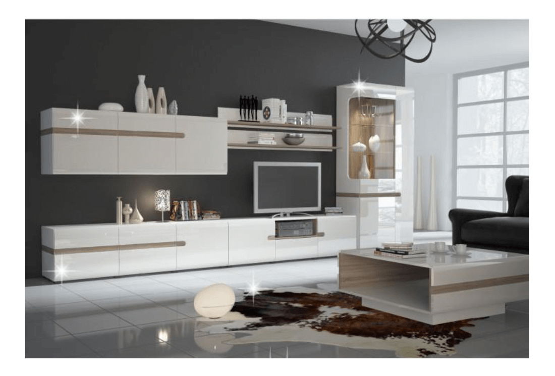 Luksuzan namještaj izrađen od laminirane iverice otporne na ogrebotine, vlagu i visoke temperature. Prednji dijelovi su izrađeni od MDF ploče bijele boje s visokim sjajem HG. Moguće je dokupiti LED rasvjetu.