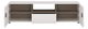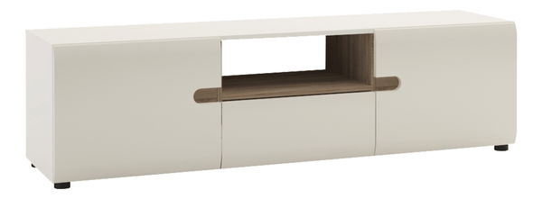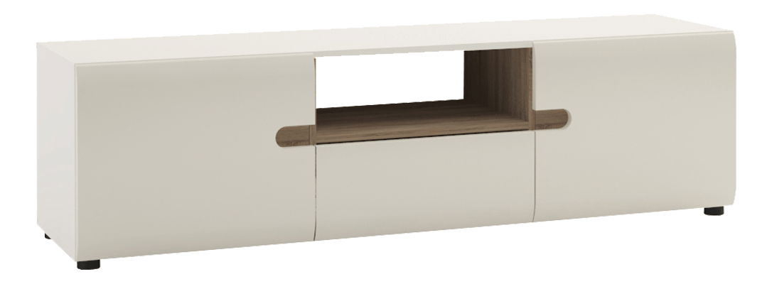 Široki trodijelni TV stolić s otvorenom policom namijenjenom za audio/video uređaj. Stolić je u bijeloj sjajnoj boji, a polica je u dizajnu hrast sonoma tartuf.