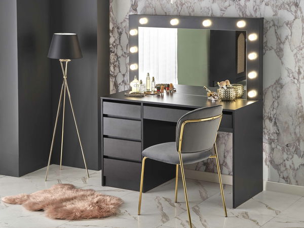 Glamurozni toaletni stolić Hektor XL kombinira funkcionalnost s elegantnim dizajnom, što ga čini luksuznim dodatkom vašoj spavaćoj sobi ili garderobi. Izrađen je od laminirane ploče za namještaj, koja pruža čvrstoću i izdržljivost, ali istovremeno izgleda elegantno i sofisticirano. Stol je opremljen integriranom LED rasvjetom, koja sadrži 12 žarulja, pružajući dovoljno svjetla za šminkanje ili oblikovanje kose. Ima pet ladica, koje su opremljene kugličnim vodilicama za glatko i tiho otvaranje i zatvaranje. Ovaj toaletni stolić idealno je mjesto za pohranu kozmetike i dodataka, a istovremeno dodaje glamur i moderan izgled sobi.