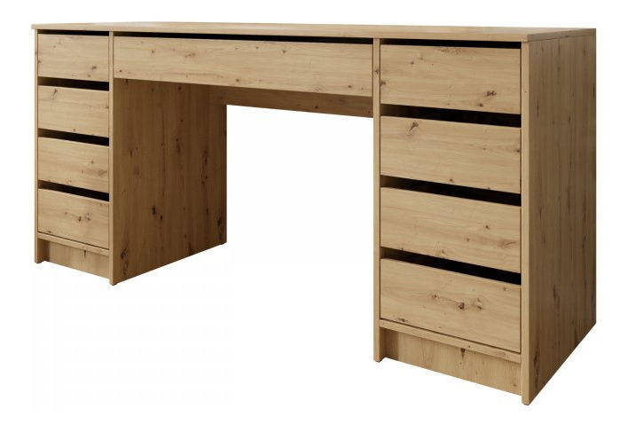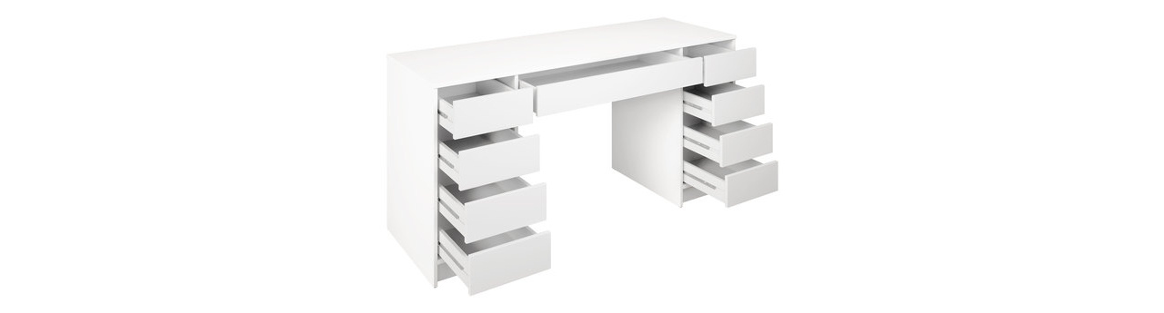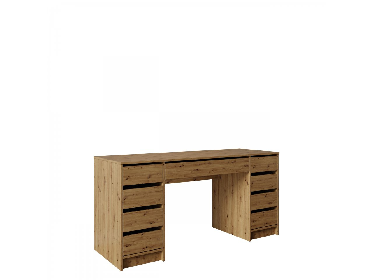 Toaletni pisaći stol idealan je izbor za one koji traže udobnost i stil. Toaletni pisaći stol Heron Bis 2u1 model je koji će ispuniti sva vaša očekivanja! Ovaj univerzalni komad namještaja bit će idealan za rad u kućnom uredu ili svakodnevno učenje. Uz pomoć pisaćeg stola možete u spavaćoj sobi stvoriti i kozmetički kutak. Brojne prostrane ladice smještene s obje strane toaletnog stola pomažu organizirati kozmetiku i dodatke, kao i dokumente i školski pribor. Moderan karakter pisaćeg stola s ladicama uklopit će se u gotovo svako uređenje! Dimenzije: širina: 154 cm, visina: 76 cm, dubina: 55 cm. Izvedba: laminirana ploča debljine 16 mm, ABS i melaminska traka, stražnja ploča od HDF-a, kuglični vodilice, bez ručki, crne plastične noge. Ogledalo s rasvjetom prikazano na jednoj od slika nije uključeno. Jamstvo: 24 mjeseca.