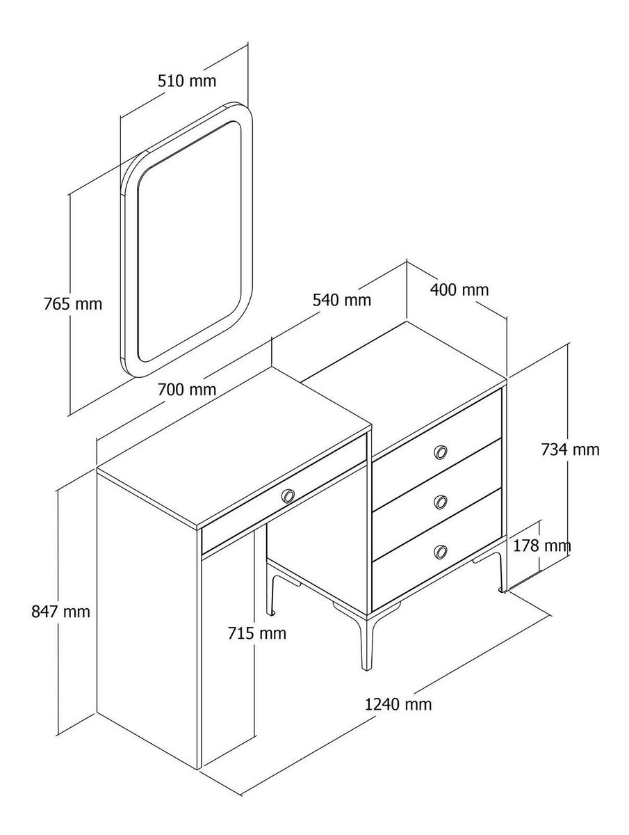 debljina: 18 mm, plastične ručke metalne noge, komoda veličina: širina: 124 cm, visina: 84,7 cm, dubina: 40 cm, visina nogu: 17,8 cm, veličina ogledala: širina: 51 cm, visina: 76,5 cm