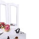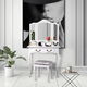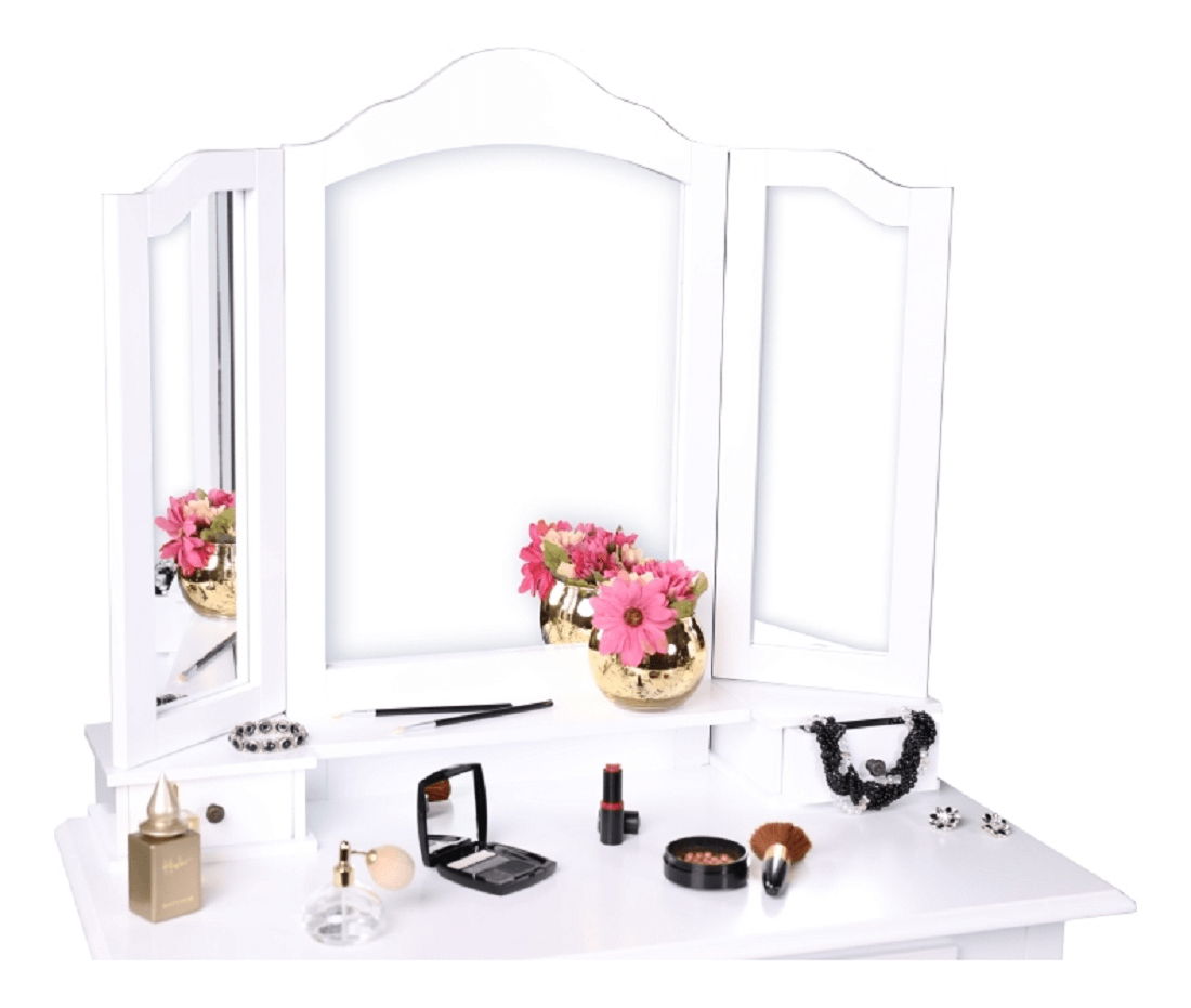 Kozmetički stolić Ravana izrađena je od MDF ploče, masivnog drva, srebrne tkanine, 100% poliestera, a ručke su metalne.