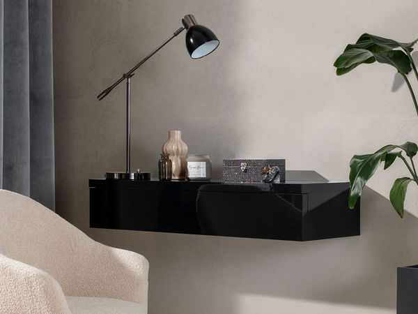 PrikazToaletni stolić idealan je izbor za one koji traže udobnost i stil. Zidni toaletni stolić Wopandi jedinstven je komad namještaja s elegantnim dizajnom i funkcionalnošću. Montira se na zid, čime dodaje prostor vašoj spavaćoj sobi. Njegov minimalistički dizajn i čiste linije savršeno se uklapaju u moderne interijere. U sredini toaletnog stolića nalazi se praktična ladica koja nudi dovoljno prostora za pohranu kozmetike, nakita i drugih osobnih stvari. Zahvaljujući tome sve potrebne stvari imate uvijek nadohvat ruke, a ploča stola ostaje čista i uredna. Dimenzije: širina: 100 cm, visina: 20 cm, dubina: 38 cm. Izvedba: korpus i prednji dio: 32 mm debela iverica, stražnji dio izrađen od iverice debljine 16 mm, rub: ABS (vidljiva mjesta), papir (nevidljiva mjesta), kuglične vodilice s usporivačem, bez ručki. Jamstvo: 24 mjeseca.