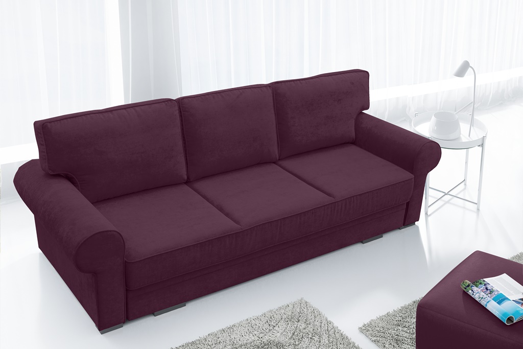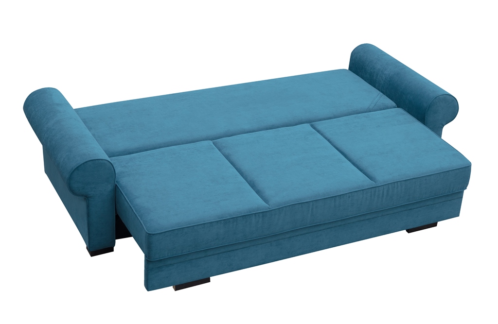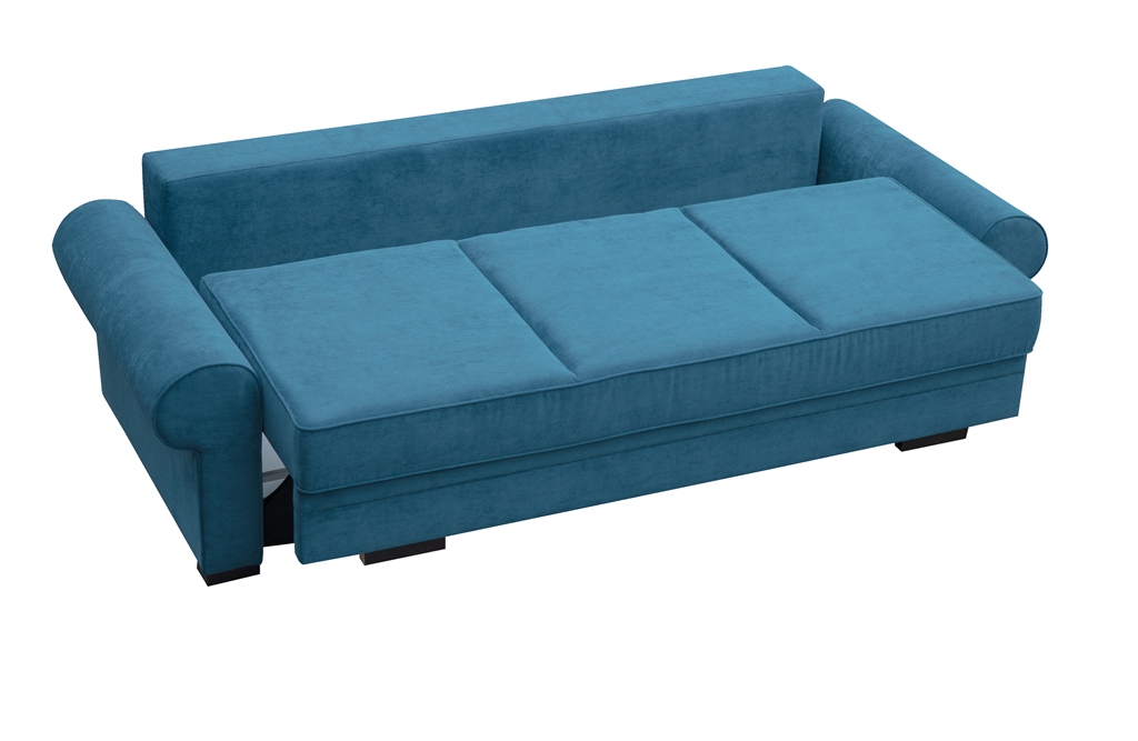 Trosjed na razvlačenje Bremo. Površina za spavanje nakon razvlačenja iznosi 200 x 147 cm. Trosjed ima i prostor za odlaganje.
