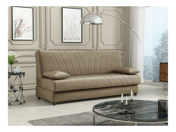 Trosjed State idealan je izbor za one koji traže udobnost i stil. Sofa koja će uljepšati svaku dnevnu sobu. Sofa ima izraženo prošivanje sjedišta i naslona. Sofa je na razvlačenje, a kada se razvuče, dobivate prostor za spavanje dimenzija 118x195 cm. duljina: 195 cm, širina: 85 cm, visina: 90 cm, prostor za spavanje: 195 x 118 cm Boje: moguće je odabrati iznad Izvedba: okvir: borovina + iverica + MDF, sjedište: T25/42 pjena + bonell opruga, naslon: pjena T25/42 + bonell opruga, trosjed na razvlačenje, automatski sustav sklapanja tipa CLIC-CLAC, spremnik za posteljinu, noge: crna plastika, tapecirani naslon čvrsto fiksiran, jastuk bez zatvarača, nije slobodno stojeća Dimenzije spremnika: - duljina: 170 cm, - širina: 73 cm, - visina: 18 cm Jamstvo: 24 mjeseca