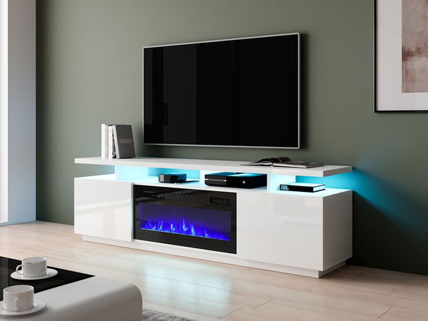 TV ormarić/stolić s kaminom Aurora (bijela + bijeli sjaj)