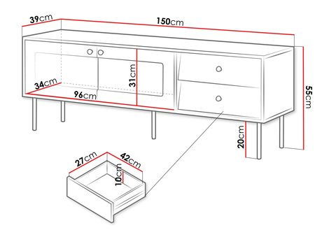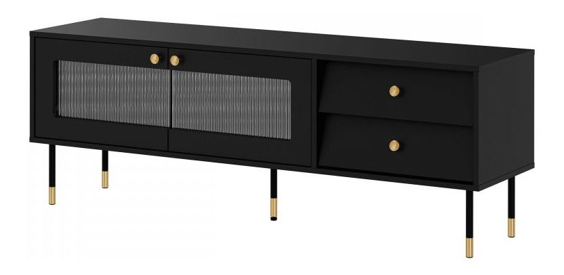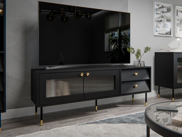 TV stolić je idealan izbor za one koji traže udobnost i stil. TV ormarić Aurezi 150 cm osigurat će originalan izgled interijera vašeg doma. Nekonvencionalan izgled ovog komada namještaja unosi u dnevni boravak dašak modernosti. Ono što prvo privlači pažnju je originalan raspored ladica. Bez smanjenja njihovog kapaciteta naglašava moderan izgled oblika. Štoviše, stakleni dio TV komode oduševit će svojim žljebljenim završetkom. Moderan detalj u obliku žljebova urezanih u staklu ukrašava prostor i povoljno kamuflira i predmete posložene unutra. Sve je postavljeno na visokim nogama, zahvaljujući čemu je TV stolić Aurezi prilagođen robotskim čistačima. Dimenzije: širina: 150 cm, visina: 55 cm, dubina: 39 cm. Izvedba: korpus: laminirana iverica debljine 16 mm, prednja strana: 16 mm laminirana ploča + 16 mm MDF ploča, stražnji dio namještaja izrađen od HDF ploče, rub: ABS + PVC, metalne noge: crne – u zlatnoj i crnoj boji, bijelo-crne, plastične ručkice: crno-zlatna boja, bijelo-crna, skrivene šarke s mekanim zatvaranjem, kuglične vodilice, vrata – kaljeno staklo, ukrašeno. Jamstvo: 24 mjeseca.