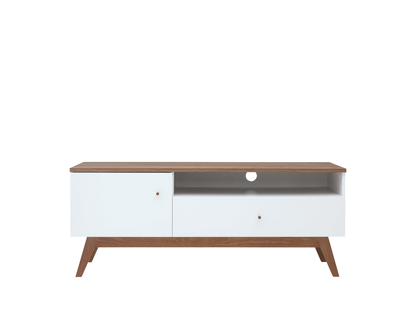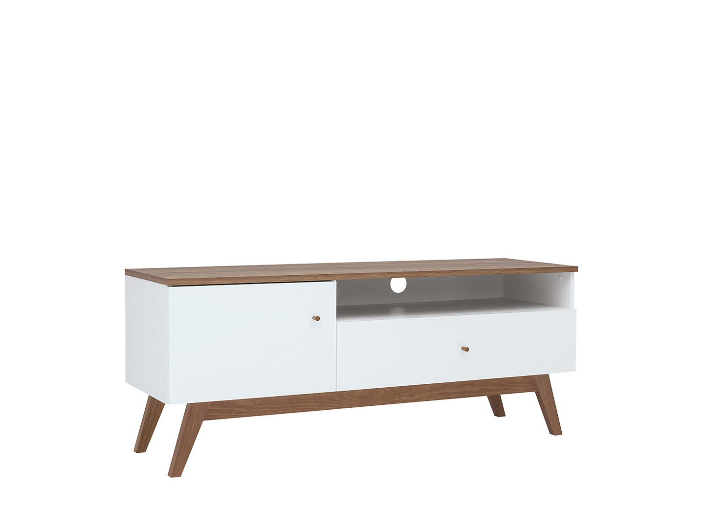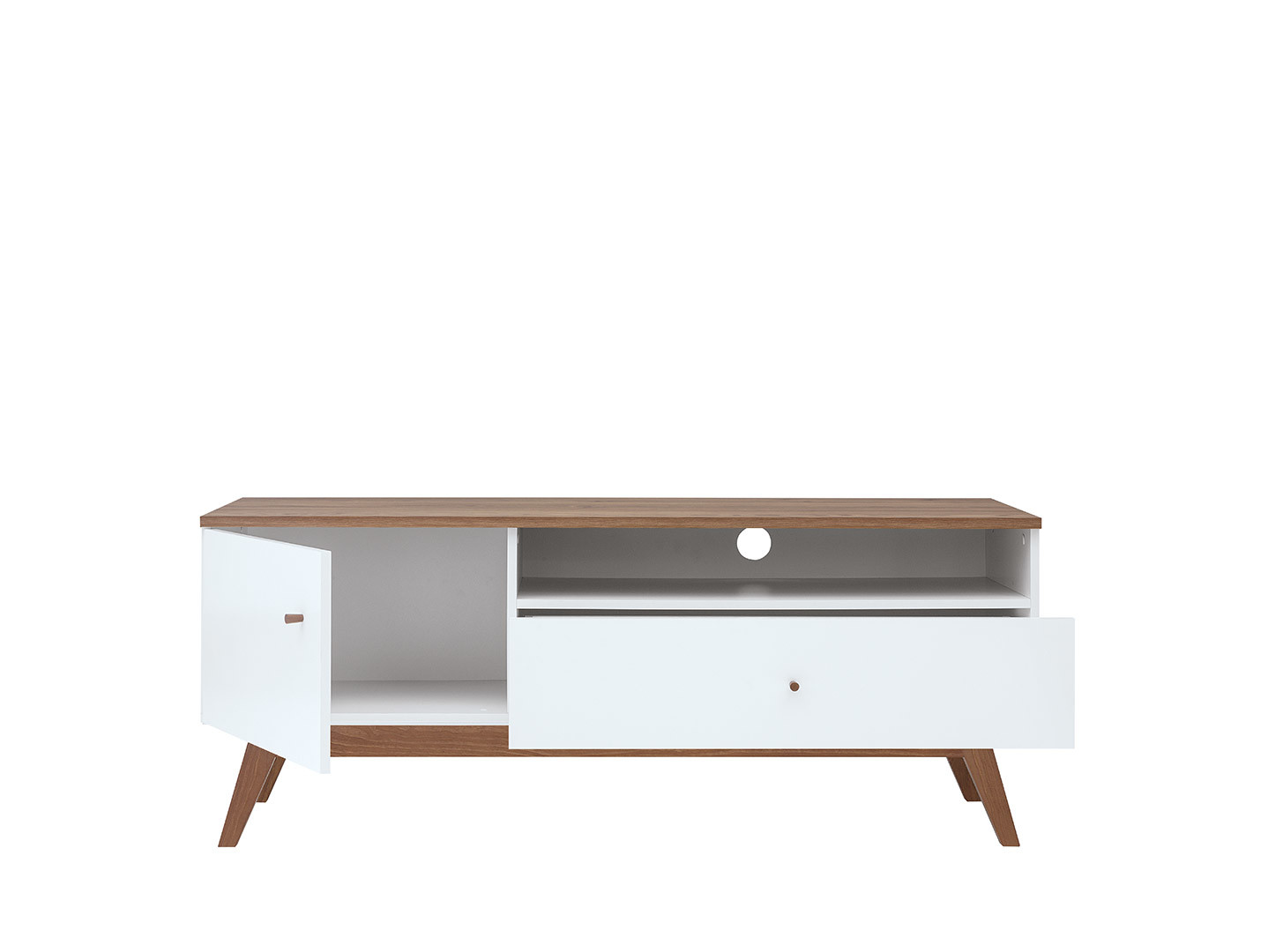 TV stolić u lijevom dijelu ima vrata, a u desnom otvorenu policu i ladicu. Stolić je postavljen na četiri drvene noge.