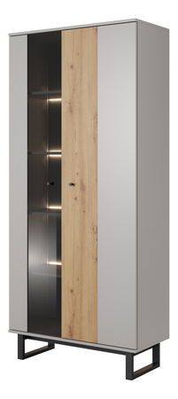Visoka vitrina Galaxit u kombinaciji platinasto sive boje i prirodnim dekorom hrasta artisan.