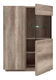 Vitrina koja spaja minimalistički dizajn s prirodnim elementima. U desnom dijelu se nalazi stakleni dio s policom za koju možete kupiti LED rasvjetu. U lijevom dijelu se nalaze vrata i police.