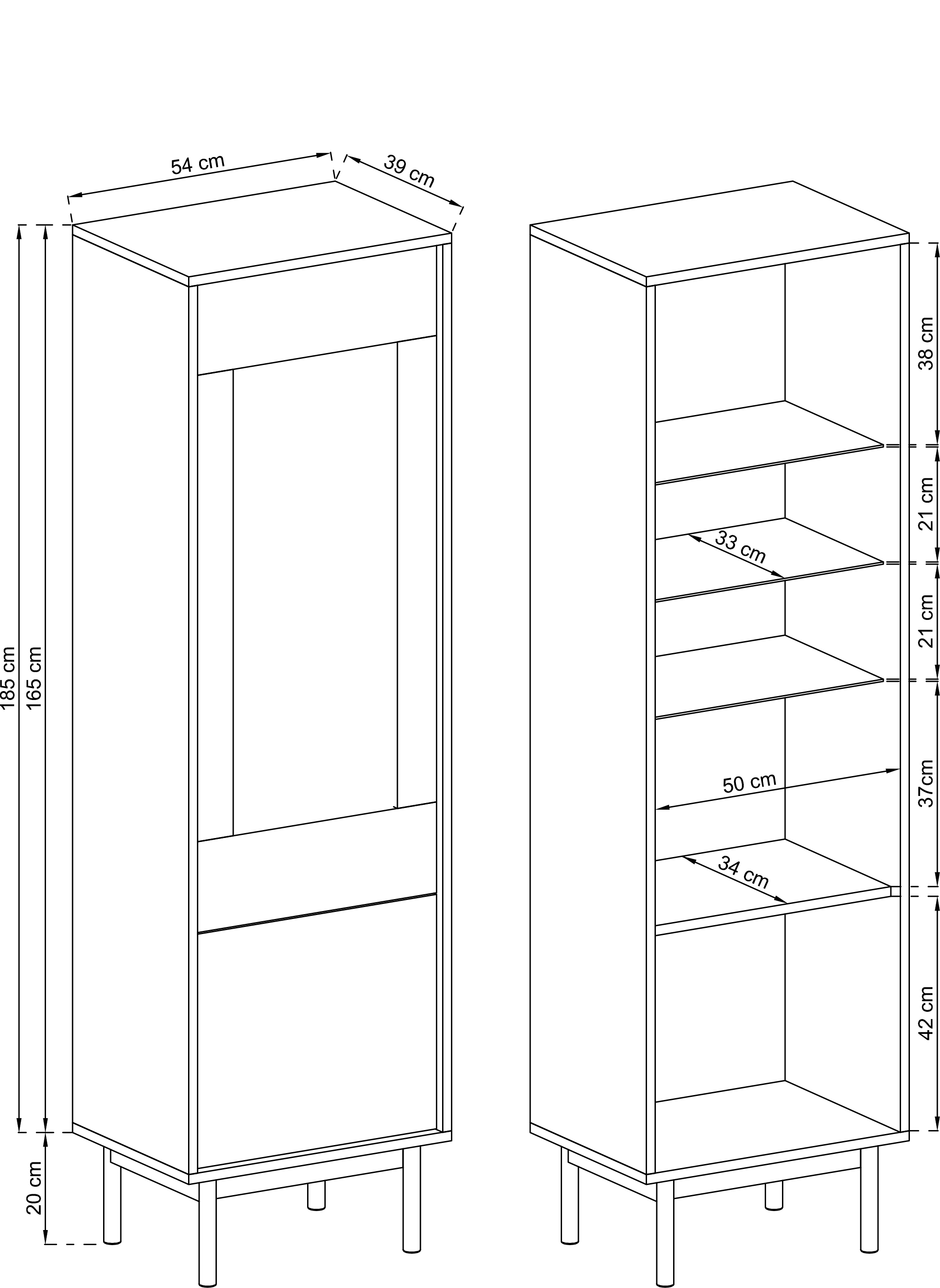 Visoka vitrina Ben 54 od kvalitetne MDF ploče. U gornjem dijelu su ostakljene police za koje možete dokupiti rasvjetu.