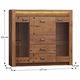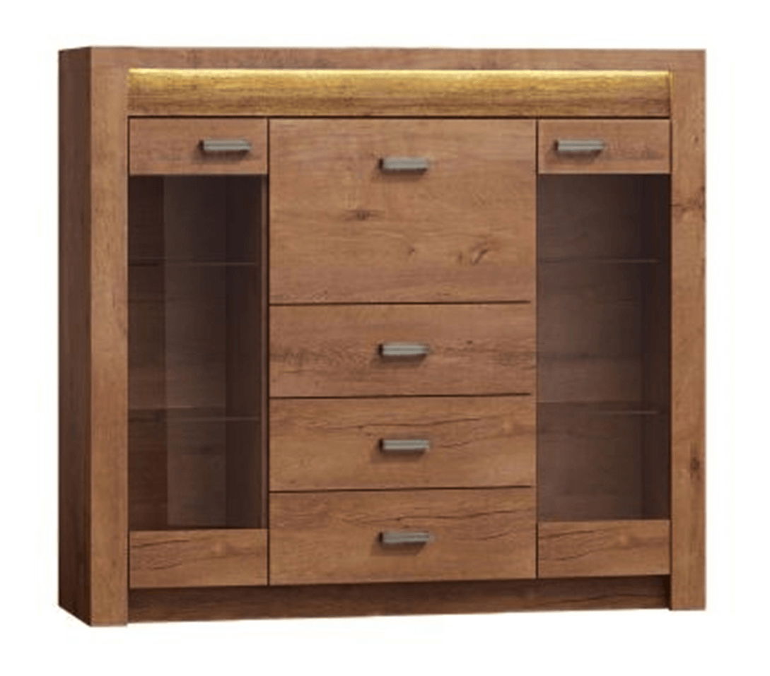 Prekrasna vitrina Inneas ima slijeva i zdesna ostakljena vrata iza kojih se nalaze staklene police. U srednjem dijelu su tri ladice i barski ormarić. Moguće je dokupiti LED rasvjetu.