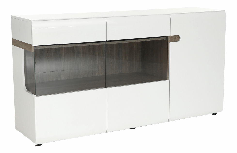Niska trodijelna, široka, sjajna vitrina s prugom u nijansi hrast sonoma tarfuf.