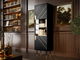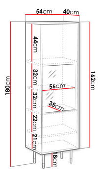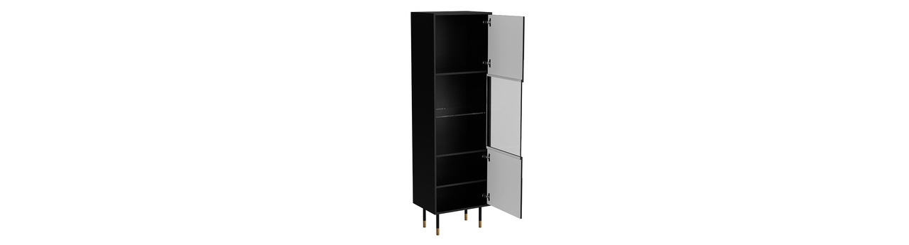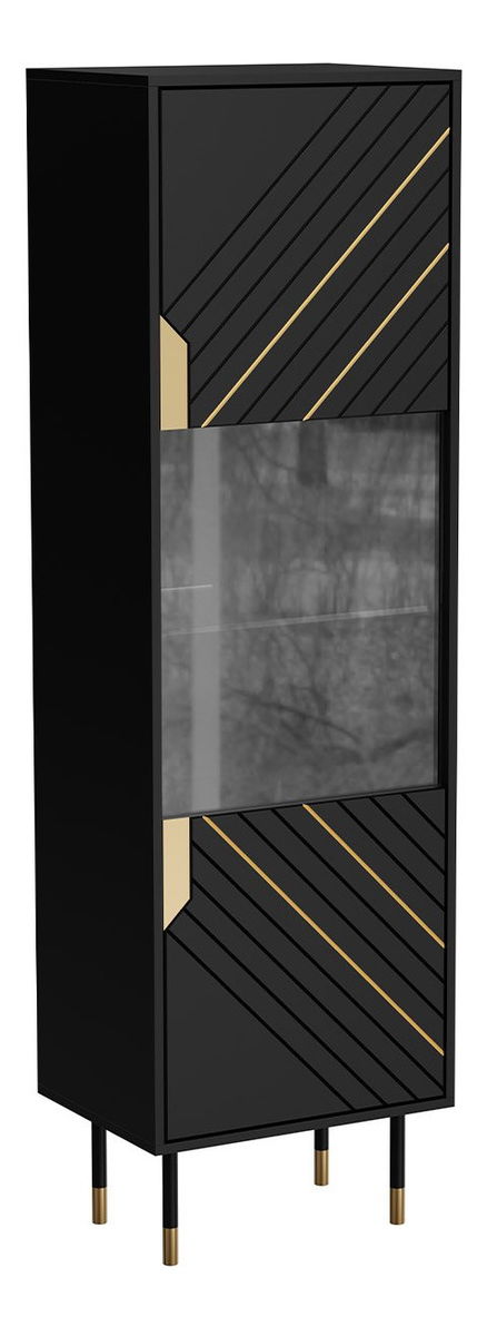 Vitrina je idealan izbor za one koji traže udobnost i stil. Dimenzije: širina: 54 cm, visina: 180 cm, dubina: 40 cm Izvedba: korpus: 16 mm debela laminirana ploča, fronte: 16 mm debela mat crna MDF + zlatni frezani lakirani elementi, stražnji dio namještaja od HDF ploče, rubovi: ABS, šarke FI35, noge: metalne u crnoj i zlatnoj boji, visine 18 cm, bez ručki, kaljeno staklo debljine 4 mm, sustav otvaranja "PUSH TO OPEN". Jamstvo: 24 mjeseca.