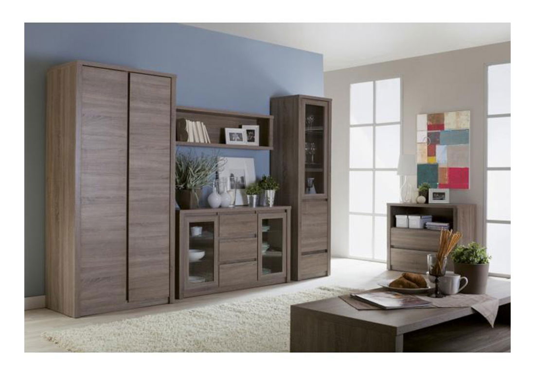 Šira komoda Modestus s 2 staklena vrata i 2 ladice u sredini. Jednostavan stil u boji hrast lefkas tamni.