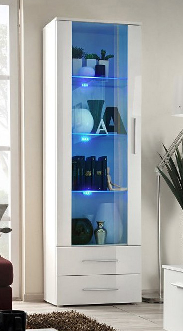 Vitrina Neo I je praktičan dodatak za dnevni boravak, radnu sobu ili ured. U donjem dijelu se nalaze dvije ladice nad kojima je prostor zatvoren ostakljenim vratima s 3 staklene police. One su osvjetljene LED rasvjetom. Ručke ladica su duge 25 cm. Dolazi u više boja i može se lako kombinirati s ostalim namještajem.