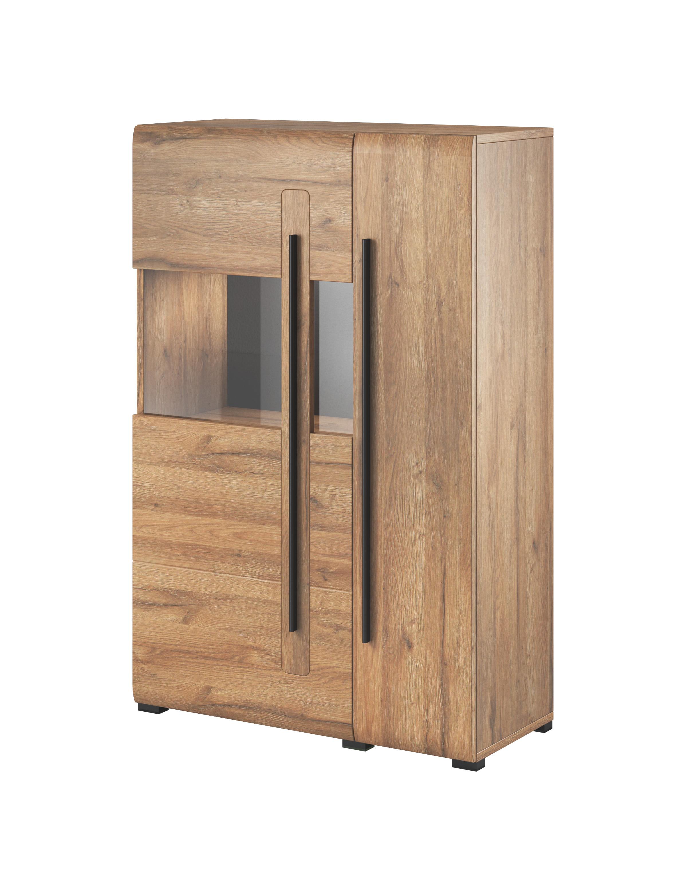 Uža vitrina s 2 vrata. Vitrina će vam zapeti za oko i svojim dugim, tankim ručkama. Lijevi dio vitrine je stakleni. Također je moguće naručiti LED rasvjetu za vitrinu.