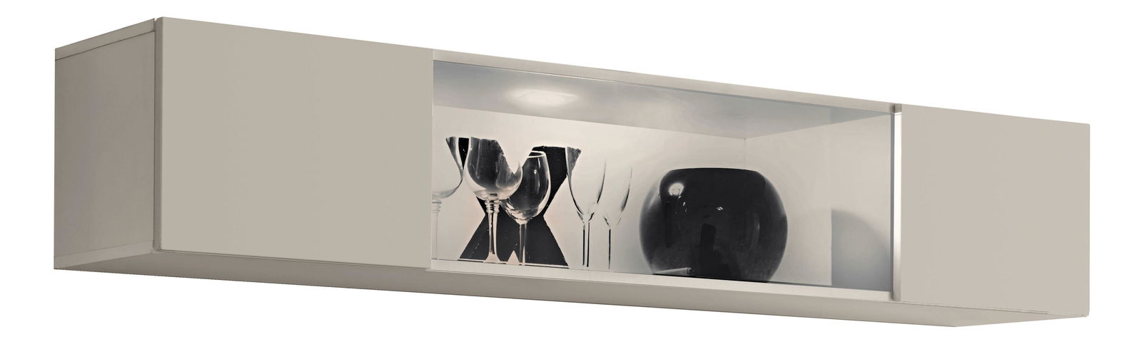 Moderna zidna vitrina s djelomično ostakljenom prednjom stranom u bezvremenskoj nijansi kašmira i praktičnim podiznim otvaranjem prema gore pomoću plinskih podizača je idealno rješenje za svaku dnevnu sobu, kuhinju ili predsoblje. Unutrašnjost vitrine podijeljena je u tri dijela, ostakljeni dio je osvijetljen LED svjetlom, zahvaljujući čemu ističe svaki detalj. Sustav bez ručki push-click omogućuje jednostavno otvaranje i zatvaranje – dovoljno je lagano pritisnuti na prednji dio. Namještaj u nijansi kašmira unosi u prostor dašak elegancije i profinjenog luksuza, a da pritom ne djeluje raskošno. Idealan je za ljubitelje minimalizma, skandinavskog ili modernog stila. Zahvaljujući kombinaciji dizajna i funkcionalnosti ovaj namještaj je idealno rješenje za svaki moderan interijer.