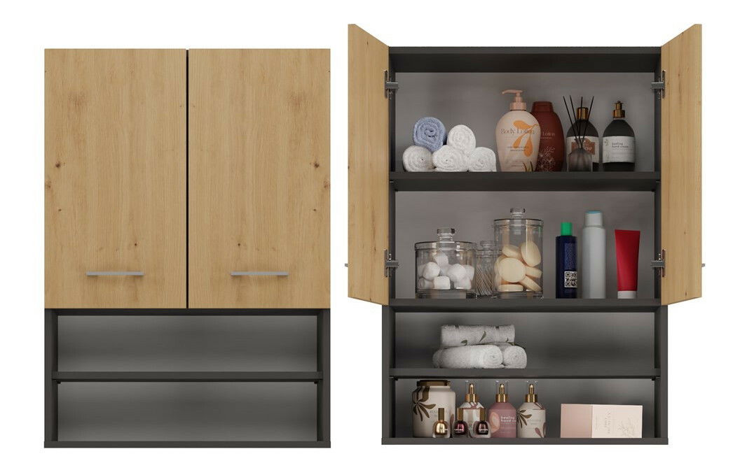 PrikazZidni kupaonski ormarić Perdieron 1 u elegantnoj kombinaciji antracita i hrasta idealno je rješenje za moderne kupaonice gdje je prostor potrebno učinkovito iskoristiti. S minimalističkim dizajnom i dvije otvorene police, kao i dvije skrivene iza vrata, nudi obilje prostora za pohranu svih potrebnih kupaonskih dodataka. Ormarić je izrađen od visokokvalitetne laminirane ploče debljine 16 mm, što jamči njegovu izdržljivost i dugi vijek trajanja. Ovaj praktični namještaj odličan je izbor za one koji traže funkcionalna i elegantna rješenja za svoju kupaonicu.