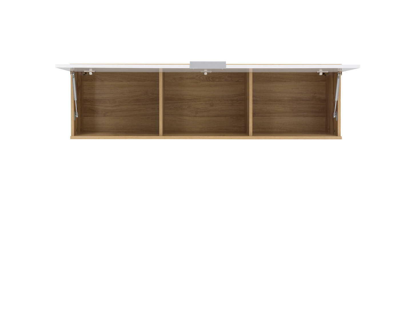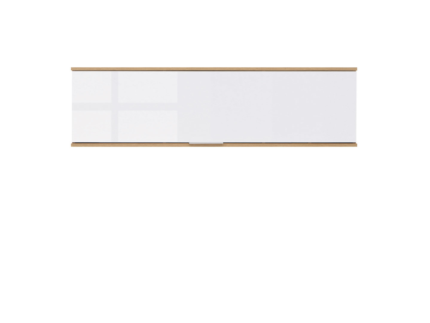 Praktični viseći zidni ormarić podijeljen je s dvije okomite pregrade na tri dijela. U tom prostoru će svoje mjesto pronaći staklene čaše, knjige ili druge sitnice. Ormarić ima preklopna vrata koja se pričvršćuju pomoću dva klipa. Svijetla boja wotan hrasta i bijeli sjaj stvaraju svjež, moderan dizajn u koji ćete se zaljubiti na prvi pogled. Nosivost ormara je max. 20 kilograma.